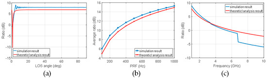(a) ratio and the LOS angle (L band); (b) average ratio (averaged by within 0°–90°) and the PRF (L band); (c) ratio and the working frequency ( = 90°).