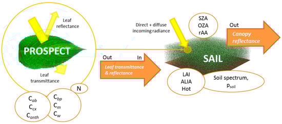 Note that specific SAIL and PROSPECT versions are embedded in the integrated radiative transfer and energy balance model “Soil-Canopy Observation of Photosynthesis and Energy” (SCOPE) [64]. Moreover, the free ARTMO (Automated Radiative Transfer Models Operator) platform provides the possibility, amongst others, to elaborate any kind of spectral data with different leaf and canopy RTMs, such as PROSPECT and SAIL [65].