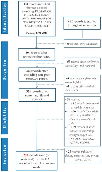 Additionally, during the paper writing process from May to November 2017, 23 more articles were published using PROSAIL (information provided through weekly Web of Science search alert, last update 16/11/2017). In the end, 281 records were left to fulfill the main criterion of having worked with the PROSAIL model in forward or inverse modes to analyze remotely sensed data for any purpose and application (see Supplementary Materials).
