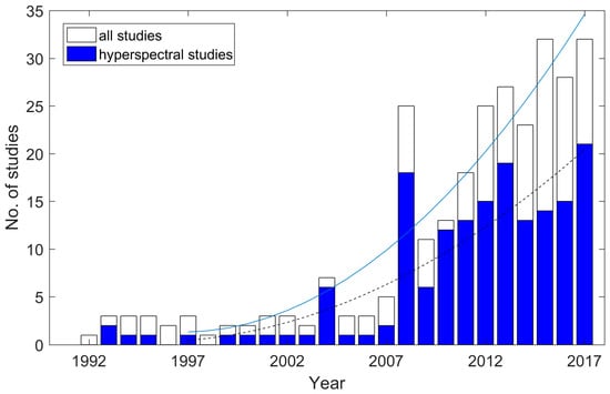 Absolute number of published papers using the PROSAIL model over the period from 1992 to 2017. White bars show the absolute number and blue bars indicate the studies analyzing hyperspectral data with the model. The trend of all studies is marked with the solid line and the trend of hyperspectral studies is indicated with the dashed line.