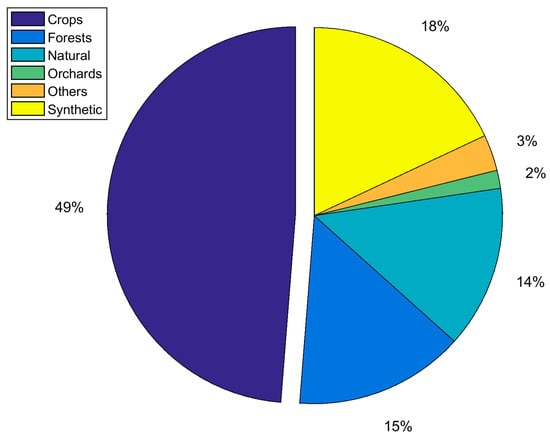As shown by the pie chart in Figure 4, tree-types were examined by 17% of the users (i.e., forests 15% and orchards 2%). Natural vegetation, which includes grassland and shrubs, was analyzed by 14% of the researches. Almost one fifth (i.e., 18%) of the studies investigated the synthetic model output for their objectives. Nearly half of the PROSAIL studies exploited a diversity of agricultural crops (49%). A distinction of crop type was only roughly performed, resulting in wheat (32%) as most often analyzed crop type, followed by maize (19%), and sugar beet (8%). Other crop types comprise rice, soybean, potato, vineyard, barley, alfalfa, cotton, mustard, sunflower, garlic, and onion.