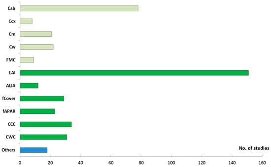 The biophysical and biochemical variables that were retrieved by inverting the PROSAIL model (or deviated using PROSAIL-designed VIs) are summarized in Figure 5. The variable of strongest interest is the leaf area index (LAI). This might be due to the easier retrievability compared to other variables. Global sensitivity analysis of the PROSAIL model showed, that LAI is one of the main driving variables that influence the variations over the whole spectrum. In some spectral regions, LAI is even the dominant driver [42]. LAI is closely followed by leaf chlorophyll content (Cab) as demonstrated by the bars in Figure 5. The combination of both—canopy chlorophyll content (CCC)—is ranked third, which is again related to the retrievability of LAI. The estimation of leaf variables, such as Cab, from reflectance at canopy scale usually achieves lower accuracies than from leaf-scale signals. This is due to other (structural) variables, such as LAI and ALIA, strongly influencing the spectral signal on canopy level [42,145]. However, spectral measurements at leaf scale are restricted to single field-based or laboratory experiments and cannot be delivered by airborne and spaceborne sensors.
