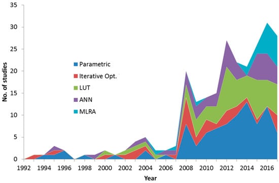 The previous review study of Jacquemoud et al. [20] found a number of 29 articles published between 1992 and 2007 using PROSPECT and SAIL in the coupled version. Compared to this period, we found an almost tenfold increase up to 2017, implying the increasing importance of the model for diverse applications. Note that the absolute increase of PROSAIL model usage is in fact in accordance with the absolute increase of remote sensing and vegetation modelling studies from 1992 to 2017. Thus, there is no relative increase of works dealing with the PROSAIL model compared to all used approaches. However, the number of studies using PROSAIL is eminent compared to the application of other CRMs, such as ACRM, INFORM, GeoSAIL, or SLC models.