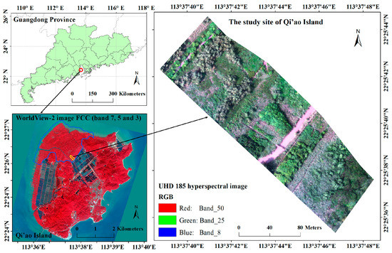 Location of the study area (Qi’ao Island), showing the WorldView-2 image (lower left) (false color composite (FCC) composed of R, band 7; G, band 5; B, band 3); and the UHD 185 hyperspectral image (right) covering the study site on Qi’ao Island (true color composition of R, band 50, G, band 25, and B, band 8). The blue polygon shows the boundary of the mangrove area on Qi’ao Island, and the yellow polygon shows the extent of the study site.
