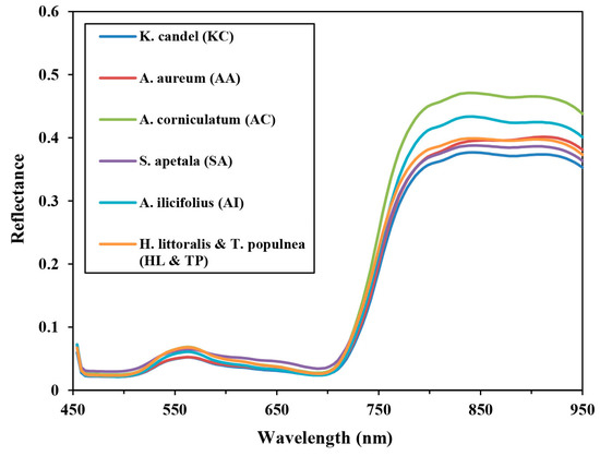 Mean spectral reflectance profiles of six mangrove species extracted from a UAV hyperspectral image within the study site.