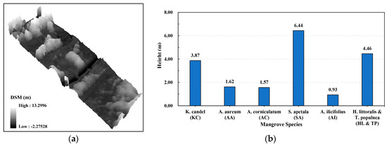 In addition, the mean heights for six mangrove species were calculated from the UAV-derived DSM, as shown in Figure 4a,b. It is clear that the SA stands are generally the highest in the study site, whereas the AA, the AC, and the AI stands have similar mean heights and the KC, HL, and TP stands are also similar. These results are consistent with the field investigations and previous studies [62,63].