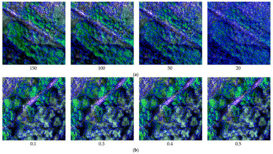 The subsets of the UAV hyperspectral image used for this study were segmented with different scale factors, shape indices, and compactness parameters, as shown in Figure 6. (1) The segmentation scale is a critical image segmentation parameter because it determines the maximum allowed heterogeneity for the resulting image objects based on image features. With the default shape index (0.1) and compactness (0.5), the scale was set to 150, 100, 50, and 20 in separate tests (Figure 6a). When the segmentation scale was defined as 150, neighboring objects with similar features were generally mixed together, for example, AA and PA. When the scale was set to 50 or 20, the segmentation results were too fragile, which would influence the efficiency of image processing. Hence, a scale of 100 was used to create homogeneous segments. (2) According to the defined scale (100) and the default compactness (0.5), the shape index was set to 0.1, 0.3, 0.4, and 0.5 in separate tests (Figure 6b). When the shape index was defined as 0.1, 0.3, and 0.4, adjacent objects with a certain degree of shape similarity were combined into one class, such as the boardwalks and the water area (river). Through several interactive tests, the shape index was set to 0.5 to create meaningful objects. (3) With the defined scale (100) and shape index (0.5), the compactness was set to 0.3, 0.5, 0.7, and 0.9 in separate tests (Figure 6c). Based on visual inspection of the segmentation results, when the compactness was 0.7, the objects of each land-cover type were more compact, and the overall segmentation results were visually the best.