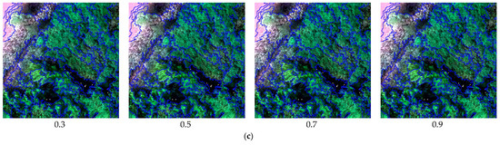 Local representation of image segmentation using different scale factors, shape indices, and compactness parameters. (a) image segmentation results with different scales (shape index = 0.1, compactness = 0.5), (b) image segmentation results with different shape indices (scale = 100, compactness = 0.5), (c) image segmentation results with different compactness values (scale = 100, shape index = 0.5).