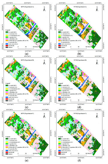 For the scheme in Experiment D, both the KNN and SVM classification results outperformed three combination schemes, i.e., Experiment A, B and C. Moreover, a comparison between Experiments A and C, or between Experiments B and D, shows that height information played an important role in improving classification accuracy. For example, the accuracy increments of taller plants, including SA, HL, and TP, were greater than those for undergrowth plants, such as AC and AI. The AC stands had high omission error with a low value of producer’s accuracy in this study site and were often placed into other classes, i.e., KC, AA, and AI, due to similarities in color and small height differences. This example demonstrates that height information can complement spectral features to enhance classification accuracy. For Experiment E, based on 14 features selected by CFS, the classification accuracy of the KNN classifier was close to that of using all 67 features, while the SVM classifier obtained higher classification accuracy. These results are consistent with previous studies [93,94] that feature selection of the high-dimensional classification, for example, plethora of spectral bands or object features, can improve the performance and efficiency by eliminating redundant information.