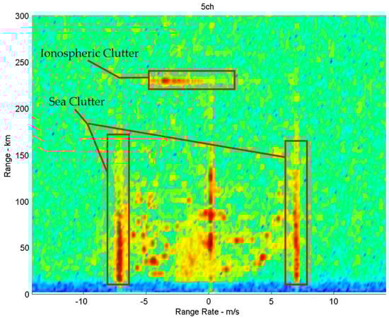 The main parameters of HFSWR are as follows: The working frequency is 4.7 MHz. The coherent integration time of the RD image is 300 s. The transmitted wave form is linear frequency modulated interruptive continuous wave. The RD spectrum can be obtained via solving the range and Doppler of the target from the field HFSWR data.