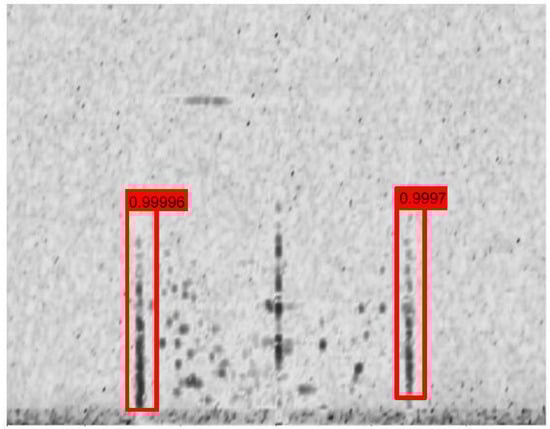 In the test result shown in Figure 3, the vertical bar region was identified as the sea clutter region. The scores on the top indicated that the network had a good performance in the identification of the clutter. Overall, for the samples in this experiment, we chose the average precision (AP) as the index of judging the performance on classification and regression of the bounding boxes.