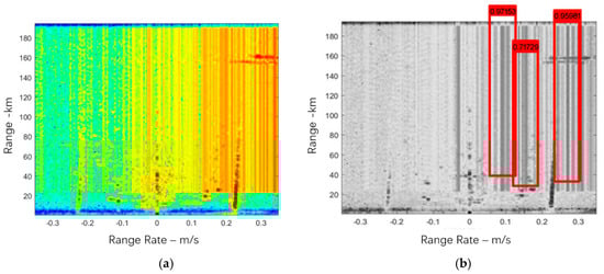 Moreover, we carried out some experiments on interference detection. We got 200 training images and 40 testing images and set the parameters as for the previous experiment. Figure 5a shows the original RD spectrum with RFI distributed in vertical bar region and Figure 5b illustrates the RFI detection result based on the deep learning network. As an indispensable step in the practical procedure of real-time HFSWR data processing, once the RFI is detected, the suppression method would be initiated to extract RFI automatically, which can maintain the strength of the target in the RD spectrum and reduce the computational cost in comparison with the conventional scheme.