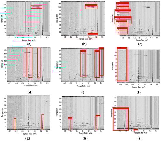 Comparison between the original images and the Faster R-CNN detection examples as well as the R-CNN detection examples in ionospheric clutter, RFI and sea clutter: (a–c) show the different detection results in ionospheric clutter; (d–f) show the different detection results in RFI; (g–i) show the different detection results in sea clutter.