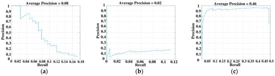The three Precision and Recall Curves of ionospheric clutter, RFI and sea clutter tested on Faster R-CNN, showed in sub-figure (a), (b) and (c), respectively.