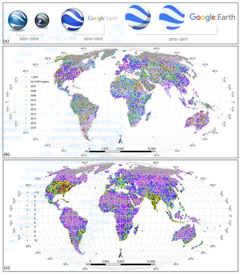 (a) The evolution of the GE logo from 2001 to the present; (b) the dates of the most recent VHR satellite imagery (<5 m resolution) available in GE as of January 2017; (c) the number of VHR satellite image sets available in GE. The original point dataset can be downloaded from https://doi.org/10.1594/PANGAEA.885767 and was collected at a spatial resolution of 1°.