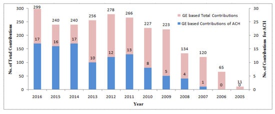 Annual literature counts of contributions introducing GE applications, extracted from the database Scopus published from 2005 to 2016 (last access 15 May 2018).