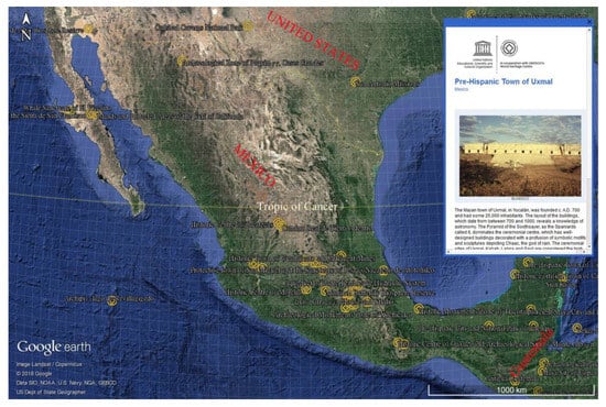 In this review, we produced the latest (updated to 2017) WHS list in KML format (KML S1) by coding and extracting the items from the latest XLS sheet data and linking and visiting the photo collections from the UNESCO-WHC website []. For instance, the WHS list by country lists Mexico as the home of the seventh largest number of sites with 34. The public then only knows that Mexico has 34 WHSs and can read their tedious descriptions in the XLS file as well as the GEORSS, RSS, and XML files, but it can learn more about sites from the KML file in GE: For example, exact locations, general situations, photos, and spatial distribution features. The Tropic of Cancer effectively divides Mexico into temperate and tropical zones. By browsing the KML file in GE, it can be found that most WHSs are concentrated to the south of the Tropic of Cancer (Figure 4); in particular, the cultural properties and distribution patterns of the sites are maybe closely related to the terrain and landforms [].