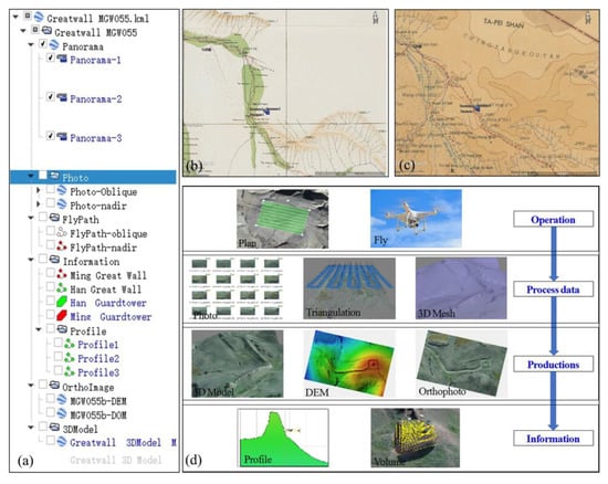 The integration of geospatial data of the Great Wall in Northwestern China. (a) The overall tree structure of KML layers in GE; (b) the archaeological maps made by Stein []; (c) the archaeological maps made by Hedin []; and (d) the operation flowchart for our UAV investigation. We deleted the photo layer in the supplementary file (KML S2) owing to the volume being too large to submit for peer review.
