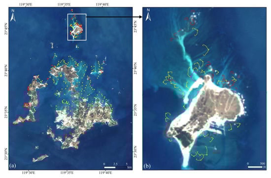 (a) Spatial distribution map of Stone Tidal Weirs (STWs)on Penghu Islands, China; (b) close-up image of (a) in Chipei Island. The red, yellow and violet represent the arched, single-room and double room STWs, respectively. (The base map is the Landsat-8 OLI image, which can be downloaded from http://www.usgs.gov).