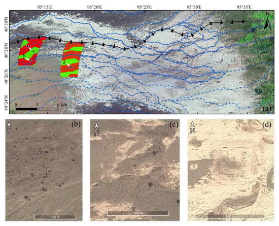 Medieval post stations in Dunhuang. (a) Prospective sub-areas to medieval post stations based on Landsat image interpretations and GIS analysis, red and green areas represent the high and low archaeological potential, respectively, blue dotted lines indicate dried and buried channels, and the black line indicates the Great Wall of Han Dynasty; (b–d) GE VHR images from September 2013 (© 2018 Digital Globe) of post station sites.