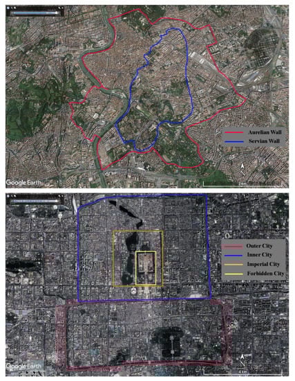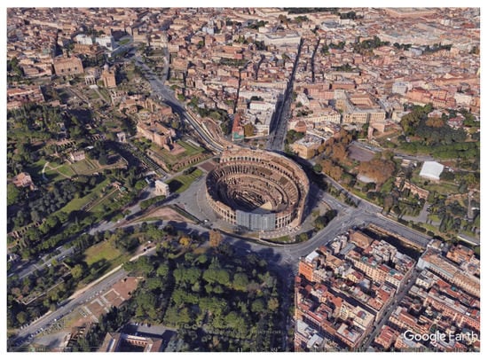 Two kinds of modelling needs to be distinguished: One is the construction of static 3D models (such as those models in the ‘3D buildings’ layer in GE), another is the modelling of dynamic phenomena/processes []. The former is the meaning of ‘modelling’ in this review. GE is simply based on 3D maps, with the capability to show 3D ancient buildings and structures (such as the Roman Colosseum (Figure 10), which consists of users’ submissions using SketchUp, a 3D modelling program software.) Thus, based on the 3D model, virtual tours in GE offer an expanded chance to make ACH sites more accessible for a broader audience []. GE Pro Version 7.3 provides several virtual tours as examples. The Forbidden City case was described in this review as a pilot (KML S5).