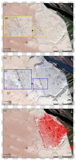 Recently, GE VHR imagery was used to track heritage loss across Syria and Iraq [,,,,,,] and to assess the damage to Syria’s WHSs caused by ISIS and the Syrian civil war [,,]. The results of this analysis indicated that more than one quarter of the archaeological sites exhibited severe damage, including five of the six Syrian WHSs and six of the 12 Tentative WHSs []. A well-known example is the Hellenistic/Roman site of Dura Europos on the West bank of the Syrian Euphrates (Figure 9). The site was submitted to the Tentative World Heritage List in 1999 but was resubmitted as a joint property with the site of Mari in 2011 []. Less than a third to half of the city has been excavated so far. During the three years (2011–2014) that separate the two GE VHR images (Figure 9) that were analyzed, the site was subject to extremely heavy looting. A long history of pre-war looting extending back several decades is visible in an early 2011 GE VHR image (Figure 9a) of the site, but in 2014 (Figure 9b), the site was further damaged by looting, with thousands of new holes visible across the entire site []. Most of the public applications capture the perceptual and qualitative aspects of the looting at the site; the professional applications generally focus on the quantitative and rational aspects of the changes. Figure 9b shows that, inside the ancient city wall, the disruption was so extensive that counting individual looting pits was impracticable—the pits overlap so that it is impossible to distinguish one pit from another. Beyond the ancient city wall, the density of looting was lower but still severe, with scores of individual pits scattered throughout the area, as shown in Figure 9b.