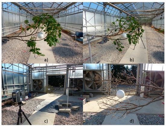 Example branches set-up in laboratory: (a) Leaf-on Q. pubescens branch; (b) Half-foliated Q. pubescens branch; (c) Scanning leaf-on Q. ilex branch; (d) Leaf-off Q. ilex branch.