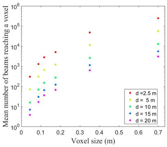 Mean number of beams reaching a single voxel as a function of its size, for FARO scans. Coloured series correspond to the different distances between scanner and vegetated volumes, from 2.5 to 20 m.