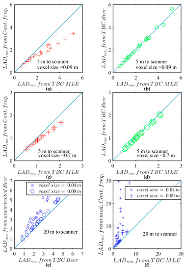 The most basic estimator is derived from the Contact Frequency () method, initially developed for actual probe (inclined point quadrat method [28]). The CF attenuation coefficient is estimated as the RDI divided by the mean path length . When applied to TLS data, this estimator is expected to be negatively biased, since the volume occluded by vegetation elements in the voxel remains unexplored [12]. It results in an overestimation of the sampled volume, leading to an underestimation of LAD, which was confirmed in Reference [18]. As a consequence, it has been suggested to modify this method (Modified Contact Frequency, MCF [12]). The MCF attenuation coefficient is estimated by dividing the RDI by the mean free path length , instead of by the mean path length. The relevance of such a modification has been theoretically established by Reference [15], who demonstrated that the modified contact frequency was indeed the Maximum Likelihood Estimator (MLE) of the attenuation coefficient, provided that vegetation elements were small and randomly distributed. The authors also demonstrated that no specific correction of the MCF was required when path lengths were unequal, which is the case in cubic voxels [13,21]. When element size is small and/or beam number is low, the MCF is biased and can be corrected in the so called theoretical bias corrected “TBC MLE estimator” . It is important to note, that this TBC estimator implements corrections for theoretical biases but not those arising from vegetation distribution and instrument specifications. The TBC MLE is thus potentially biased in regard to actual TLS and field data, which is the subject of the present comparison.