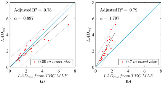 Comparison between (derived from ) and reference measurements , when the FARO scanner was at short distance of Q. ilex (d = 2.5 m), for two voxel sizes (a) 0.09 m; (b) 0.7 m. Red dots represent each individual leaf samples (leaf on and half defoliated). The blue lines represent the no bias line. The black lines represent the linear fit (with slope , which is the calibration coefficient defined in Equation (6)). Black dotted lines represent the 95% confidence interval of the prediction. This figure illustrates that a change in voxel size induces a shift in the slope of the relationship between raw estimations and reference measurements.