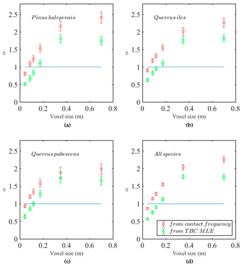 Calibration factors for (Equation (6)) as a function of voxel size for (a) P. halepensis, (b) Q. ilex, (c) Q. pubescens and (d) for all species mixed. (blue line) corresponds to the no-bias line, whereas correction factors and correspond to respectively over and under estimation. The Contact Frequency estimators are in red. The TBC MLE estimators are in green. Vertical bars are 95% confidence intervals for each regression coefficient . This figure illustrates that a change in voxel size) induces a shift in the slope of the relationship between raw estimations and reference measurements.