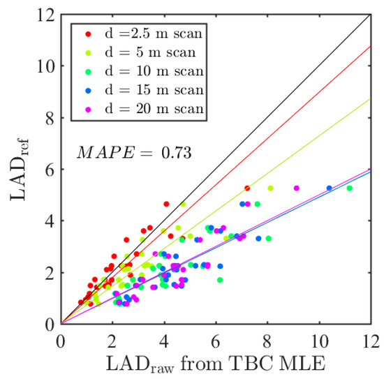 Comparison between , derived from the TBC MLE () and reference measurements for Q. ilex with the 0.09 voxel size. The different coloured dots correspond to various distances d to scanner. The black line represents the no bias line. Other coloured lines correspond to regression between estimates and reference. This figure illustrates that the prediction of the FARO scanner was highly sensitive to distance to the scanner, as raw LAD increased with this distance. MAPE is the Mean Absolute Percentage Error.