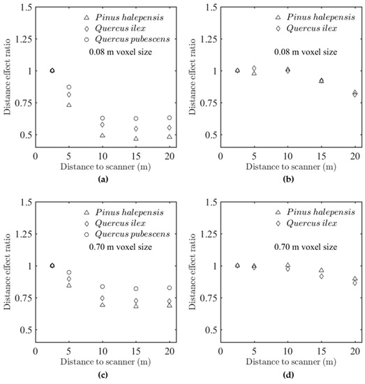 Sensitivity to distance to scanner of derived from the TBC MLE (), expressed by the “distance effect ratio” (Equation (7)), which was the ratio between value at 2.5 m to values at a distance d (m). Distance effect ratios are shown for the different scanners and two voxel sizes: (a) FARO scanner, voxel size = 9 cm; (b) RIEGL scanner, voxel size = 9 cm; (c) FARO scanner, voxel size = 70 cm; (d) RIEGL scanner, voxel size = 70 cm. This figure shows that the distance effects were much smaller with the RIEGL than with the FARO scanners. The distance effects are sensitive to voxel size and, in a lower extent, to the species.