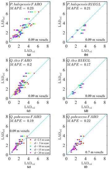 Figure 6 illustrates the influence of the distance to scanner on the raw LAD, for the same case as Figure 4a (i.e., Q. ilex -0.09 m voxel size), the differently coloured dots corresponding to the different distances to scanner. The coloured lines show the slopes of the relationship obtained at the different distances. Obviously, a strong effect of the distance of measurement is observed with the FARO scanner (up to +100% of 2.5 m value for some of the branches), leading to a strong overestimation of the LAD at greater distances.