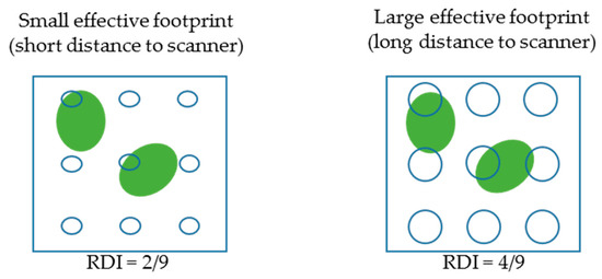 In addition to biases inherent to vegetation structure, the instrument can introduce deviations from actual LAD values, mostly as a consequence of the finite cross-sectional diameter of the scanner beam, in particular with single return phase shift scanners. A laser beam can indeed partly hit a leaf, while a remaining—not intercepted—fraction of laser energy continues its path before possibly interacting with another object located in the background. In this case, a single return phase-shift scanner registers a unique point which can be anywhere between the two objects, leading to a hit misplacement (mixed points, [25]). As a result, different backgrounds (vegetated vs. open) may affect any partial hit of vegetation elements and in turn, LAD predictions. In addition, as the footprint (cross-sectional area) of a laser beam increases with distance to scanner (because of beam divergence), the probability to hit vegetation elements increases, which induces an increase in the LAD estimation with distance to scanner. Such bias can be corrected by weighting estimated RDI, with distance-dependent calibrated function of return intensity [12] but to date, this approach was only applied at fixed distance only (scanning individual plants at constant distance to the scanner). Finally, the limited number of beams effectively reaching a voxel is a last source of bias and uncertainty in TLS measurement [15]. Low beam number arises from both increasing distance to scanner and vegetation occlusion.