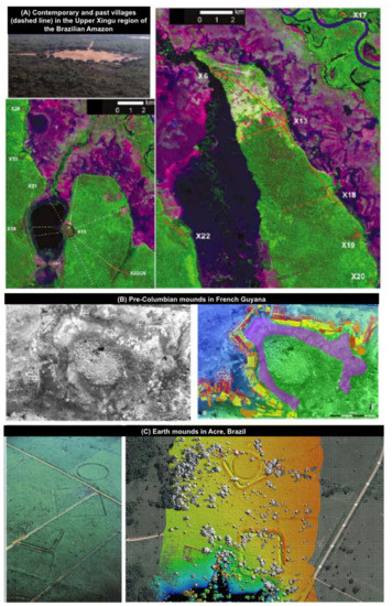 Examples of RS-enabled detection of pre-historic human activity in Mid-American tropical landscapes: (A) Contemporary and past villages (dashed line) in the Upper Xingu region of the Brazilian Amazon (dashed lines represent past villages, red lines represent known ancient roads and black lines represent ditches; adapted from [45]), (B) Pre-Columbian mounds as interpreted using photo and spectroscopic imagery (adapted from [18]), (C) earth mounds in Acre, Brazil, first exposed by deforestation (left panel adapted from [16]), then using LiDAR technology (right panel; ([21], http://agencia.fapesp.br/)).