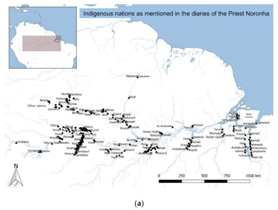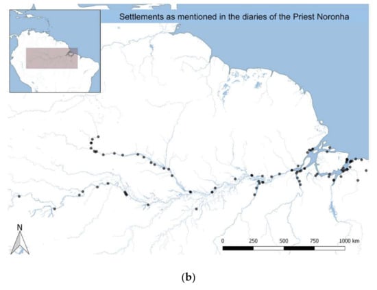 Locations of (a) indigenous and (b) non-indigenous population centers as mentioned in the diaries of Padre Noronha during the colonial period—1500s–1800s (figure reproduced with authorization from J.P. Ramalho and published in [56,57]).