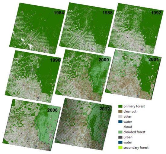 “Fishbone” road development pattern in Amazonia using Landsat TM data over 28 years. We used land surface reflectance Landsat data and classified it with maximum likelihood algorithm to distinguish the nine most dominant classes in the scene., with classification accuracies of 0.92 ± 0.05, and kappa coefficient 0.85 ± 0.08. Most misclassification occurred for secondary forest, but this is beyond the point of this figure as we use it to illustrate development of the fish-bone pattern over time. In the 2012 image the stripes correspond to the failure in the Scan Line Corrector of Landsat 7 and these were the only ones available for this year (figure from [63]).