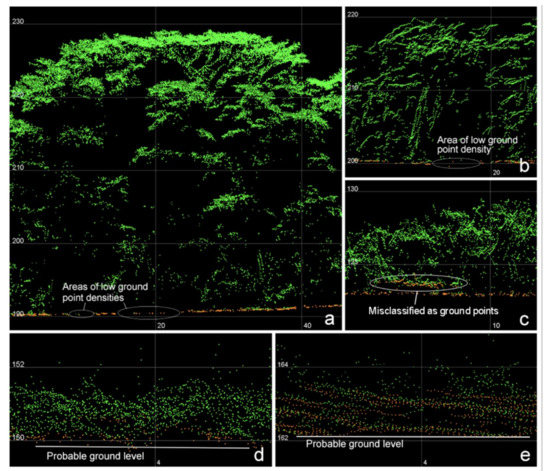 Point clouds from different vegetation types ((a) primary forest; (b) high secondary forest; (c) medium height secondary forest; (d) low secondary forest; and (e) high grass) illustrating, in green, vegetation retrievals and, in orange, ground retrievals. Archaeological sites might be detected using the orange retrievals (figure reprinted with creative commons permission from [85]).