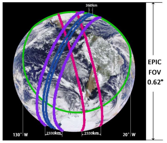 Earth Polychromatic Imaging Camera (EPIC) enhanced Red-Green-Blue (RGB) image of the sunlit Earth taken on 15 January 2017 at 18:37:04 Greenwich mean time (GMT) (https://epic.gsfc.nasa.gov/enhanced?date=2017-01-15). Areas between purple and red lines are Terra and Aqua Moderate Resolution Imaging Spectroradiometer (MODIS) 2330 km wide swaths. Blue lines depict a 360 km swath of the Multi-Angle Imaging SpectroRadiometer (MISR) sensor on the Terra platform. Terra MODIS and MISR cross the equator at 10:30 local solar time (LST) while Aqua MODIS sees the Earth at 13:30 LST. A fixed sampling area of the NASA’s Geostationary Operational Environmental Satellite East (GOES-East) is bounded by a green line. MODIS and MISR sensors on low-earth-orbiting platforms acquires radiance data over swaths at a specific LST. The geostationary GOES-East satellite collects data over a specific area of the Earth. Technical details on sensor sampling areas are given in Section 2.3.