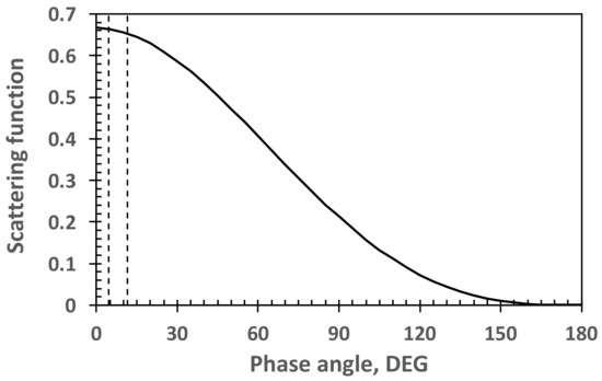 Figure 2 shows the scattering function for an ideal Lambertian sphere (. In the backscattering direction, a distant observer sees the entire sunlit sphere. The scattering function takes its maximum value at , , which is the geometric albedo. The contribution of the sphere shaded area (unirradiated face) increases with the phase angle, resulting in a monotonic decrease in from its maximum in the backscattering direction () to zero () in the forward scattering direction (). The Bond albedo coincides with the surface BRF, i.e.,