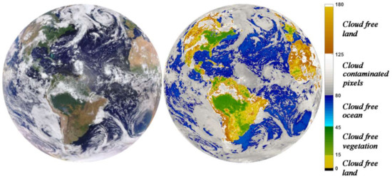 The largest uncertainties in the interpretation of the ERTI values arise in the case of clouds over ocean, i.e., when the ERTI varies around a cloud–ocean threshold of 90° (Appendix B). Equation (6) exhibits a jump from (ERTI < 90°) to (ERTI > 90°) and becomes very sensitive to errors in cloud BRF. Indeed, the cloud BRF at the NIR and green spectral bands are very close and differ only by a few percent. Small errors in their values, therefore, can change the sign of the denominator in Equation (6). The numerator is less sensitive to uncertainties because the normalization BRF by SSA makes their values more contrasting. As a result, Equation (7) can generate values below 90°. For the ocean, NIR and green BRFs are better separated, making Equation (6) more tolerant to measurement errors and consequently its values are always below 90°. To minimize the impact of the instability, we reduced the theoretical value of the threshold for clouds and ocean (Appendix C). Its value was selected to match an average fractional cloud cover value of 0.56 (within 4%) for clouds with a cloud optical depth above 2 [30]. As assessed in [30], the global cloud amount increases to about 0.68 when considering clouds with optical depth above 0.1, and to about 0.73 when including subvisible cirrus. The probability of the ERTI method with selected thresholds being able to discriminate between cloudy and cloud-free scenes is therefore about 82%, which represents the reliability of the ERTI approach. Figure 4 shows the distribution of the ERTI over a DSCOVR EPIC image and the thresholds used. One can see that ERTI values corresponding to cloud-free ocean, land, vegetation, and cloudy pixels tend to occupy different spaces within the 0° to 180° intervals.