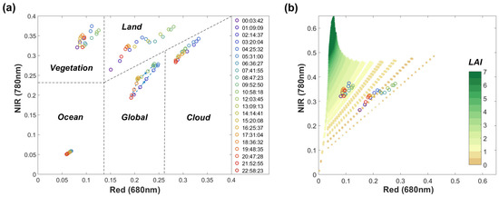 (a) Diurnal course of the scattering function on the near infrared (NIR) vs. red spectral plane (block “global”). The blocks “cloud,” “ocean”, “land” and “vegetation” show the trajectories of the mean scattering function over cloudy and cloud-free ocean, land, and vegetated pixels, respectively. (b) Domain of variation in red and NIR reflectance of bare and vegetated land simulated with the stochastic radiative transfer equation. SZA = 0°~15°, phase angle = 0°~9°. Lines show leaf area index (LAI) isolines (i.e., LAI is constant while soil reflectance varies). Circles are points from the blocks “vegetation” and “land”. DSCOVR EPIC images taken on 23 August 2016 (https://epic.gsfc.nasa.gov/?date=2016-08-23) were used.