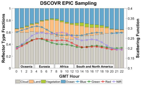 The daily and monthly average reflector type fractions were less sensitive to the sensor sampling area (Figure S1 in Supplementary Materials). Over the course of a year, the EOS (EPIC) sensors see about 60% (59.7%) of the sunlit Earth’s area covered by clouds and 25–27% (26.4%), 10–13% (12.5%), 1–2% (1.4%) for cloud-free ocean, bare land and vegetation, respectively. Their contributions to the annual average scattering function depend on the wavelength and vary between 76% and 85% (76% and 82%), 5% and 16% (6% and 16%), 8% and 17% (9% and 16%), 0.5% and 3% (0.6% and 1.8%) for the four components, respectively (Table 4).