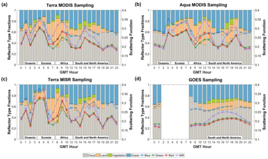 Diurnal variations of the fractional coverage of different Earth components (left vertical axis) and scattering functions at blue (443 nm), green (551 nm), red (680 nm) and NIR (780 nm) wavelengths (right vertical axis) averaged over the sampling areas of (a) Terra MODIS, (b) Aqua MODIS, (c) Terra MISR and (d) GOES-East for EPIC images acquired on 23 August 2016. Sampling areas are shown in Figure 1. Continents present in the image are shown on the horizontal axis.