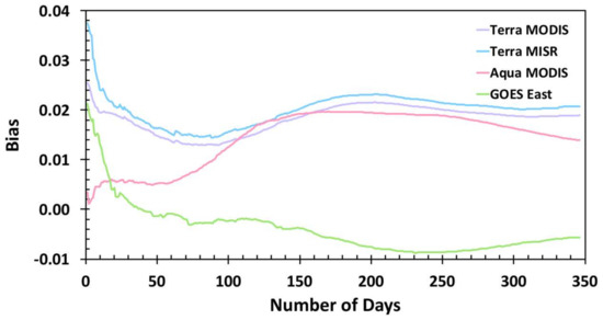 Mean biases at 780 nm, , as a function of averaging timescale for the MODIS, MISR and GOES East sampling areas for the period from 1 January (first point) through 31 December 2016 (last point). EPIC L1B data were available for 346 days in Year 2016.