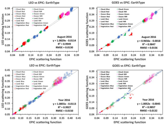 The LEO sensors tend to overestimate the daily and monthly average scattering function by about 2–4% (blue), 4–6% (green), 5–8% (red) and 6–8% (NIR). The difference increases with wavelength. The GEO underestimates scattering functions by 1–8%. Although the seasonal variations in the EOS monthly average scattering functions agreed with the EPIC estimates, their magnitudes can exceed the EPIC values by 14.8% (Figure 8 and Figure S2 in Supplementary Materials).