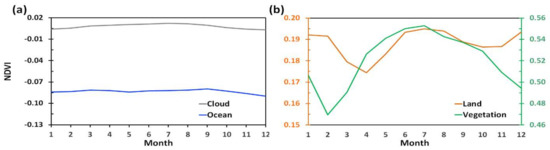 Monthly average Normalized Difference Vegetation Index (NDVI) over (a) cloudy and cloud-free ocean, (b) cloud-free bare (vertical axis on the left side) and vegetated (vertical axis on the left side) land for the year 2016. The ERTI index was used to discriminate between reflector types.