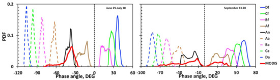 Probability density function (PDF) of the phase angle during 25 June to 10 July and 13–28 September periods over Amazonian rainforests (0° to 10°S and 60°W to 70°W) for Terra MODIS and MISR Sun-sensor geometries derived from MODIS and MISR data for the period from June 2000 to May 2008. MISR views the Earth’s surface symmetrically about the nadir in the forward and backward directions along the spacecraft’s flight track with nominal view zenith angles relative to the surface reference ellipsoid of 0.0° (camera An), (Af and Aa), (Bf and Ba), (Cf and Ca) and (Df and Da). MODIS is a single view sensor that scans the Earth’s surface across the spacecraft flight track.