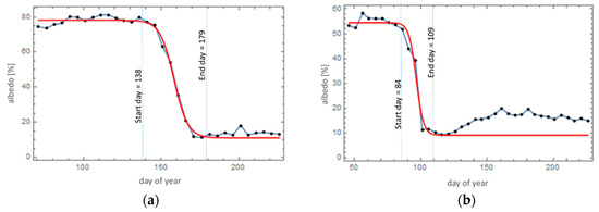 The melt season parameters were determined by fitting sigmoids to CLARA-A2 SAL pentad (5 day) mean albedo values using non-linear regression [48]. For each grid cell and year the 5-day mean albedo values from the end of January until the end of August were used for the sigmoid fitting. Figure 2 shows two examples of sigmoid fitting. To include all changes in albedo during the melt season, the dates of snow melt at the onset was taken to be the date at which the sigmoid reached 99% of its variation range (i.e., a change of 1% (relative) from the pre-melt albedo level). Likewise the end of the snow melt season was defined to be the date at which the sigmoid reached 1% of its variation range. These thresholds were chosen in order to include the whole dynamic change in surface albedo during melt season. The length of the melt season was then the difference between the start and end date of melt. The albedo values corresponding to the dates of the onset and end of melt were used as the representative albedo values preceding and following the melt season.